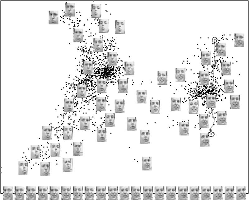 On a ainsi fréquemment observé les manifold associés à certains types d’observations afin de déterminer si le modèle avait bien intégré les règles implicites qui caractérisent cet espace. On compresse souvent cette représentation en features vectorielles de moindre dimension que l’expression finale de cet objet dans la réalité captée (cf ci dessus, un visage représenté par des milliers de pixels est réduit à un vecteur de deux dimensions).